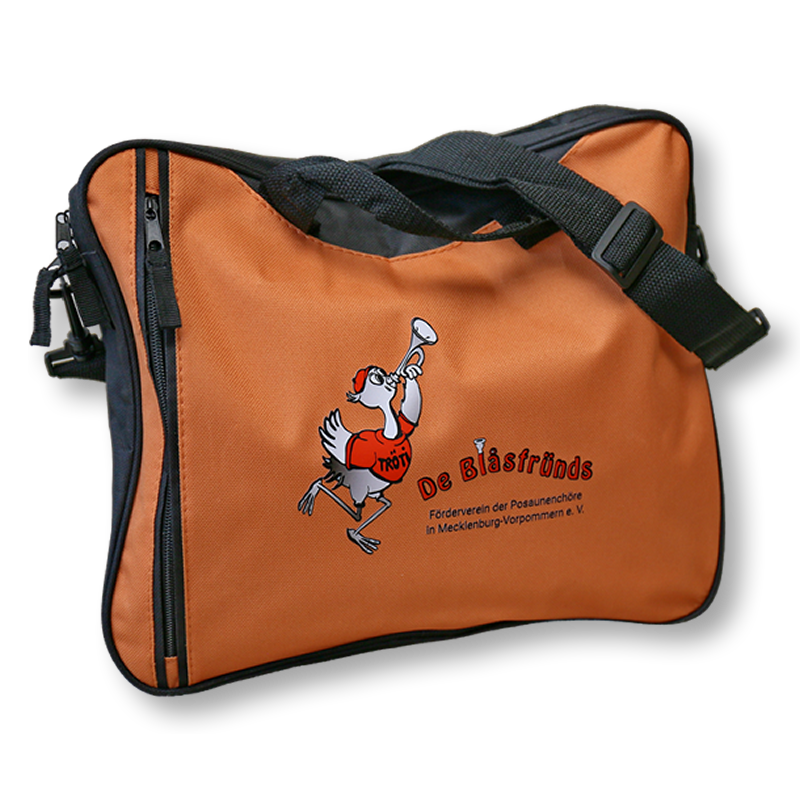 Unsere Tröten-Mehrzwecktasche ist wettergeschützt, ideal für Noten, Laptop, Trötentuch sowie Trötenschminke und Trötenfutter.