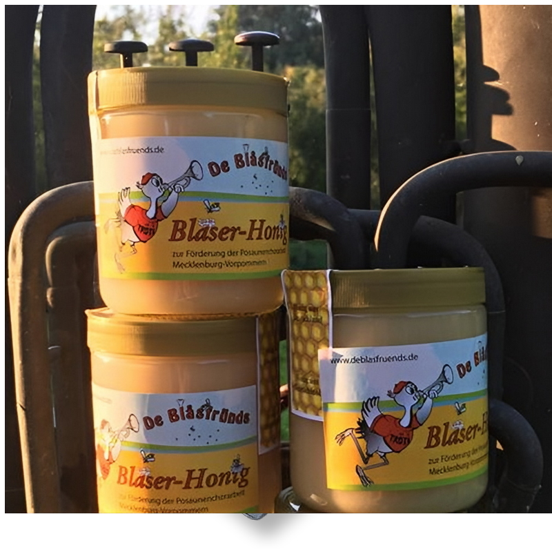 | Tröti will uns allen zu Füßen liegen mit dem hygienischen Tröti-Tuch – ein „Muss“ für alle Posaunenchorbläser in MV. Dieses Bodentuch ist aus Mikrofaser, nimmt Kondensat Wasser der Instrumente problemlos auf und sorgt für einen trockenen und sauberen Boden in Kirchen und Gemeinderäumen. Es ist mit 40 Grad waschbar. | Je nach Jahreszeit und Ernte sind verschiedene Tröti-Honigsorten im Angebot: Raps, Obstblüte, Lindenblüte oder Sommerblüte. Den Honig beziehen wir von regionalen Imkern. |